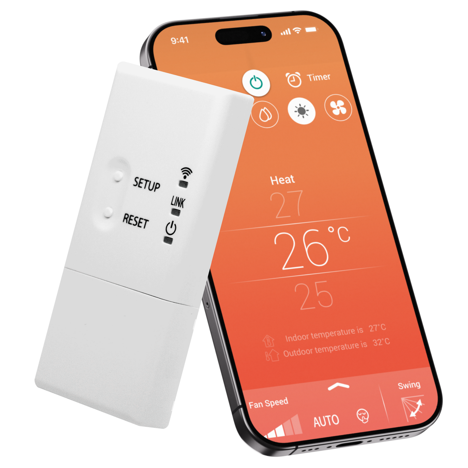 - 5 forskjellige driftsmoduser å velge mellom; Auto, varme, kjøling, tørr, bare vifte, avslått.